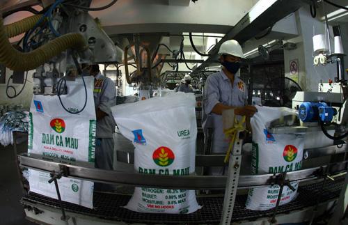 Đóng gói sản phẩm phân đạm tại Công ty TNHH một thành viên Phân bón Dầu khí Cà Mau. Ảnh: Huy Hùng - TTXVN