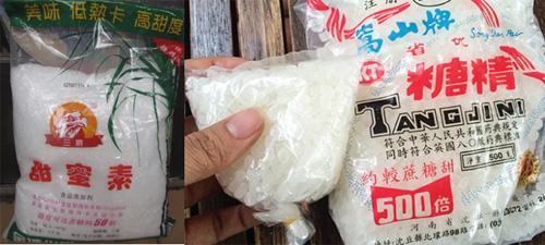 Đường hóa học (còn gọi là đường nhân tạo) là một chất tạo ngọt màu trắng không mùi, dạng bột tinh thể tan nhiều trong nước và có vị ngọt có thể gấp đến 500 lần đường mía. Hiện nay trên thị trường đang tràn ngập loại đường hóa học có nhãn hiệu Tang Jing. Trên bao bì của loại đường này cũng chỉ có tiếng Trung Quốc, hoàn toàn không có hướng dẫn sử dụng và bảo quản, thông tin sản phẩm bằng tiếng Việt. Loại đường này rất được các cơ sở làm bánh, mứt kẹo, người bán chè lựa chọn, bởi chỉ cần bỏ 1-2 viên đường vào 5 lít nước là sẽ đủ độ ngọt. Hiện loại đường này đang bán rất chạy, vì đây là thời điểm gần Tết nguyên đán, nhu cầu làm mứt, bánh kẹo tăng cao.